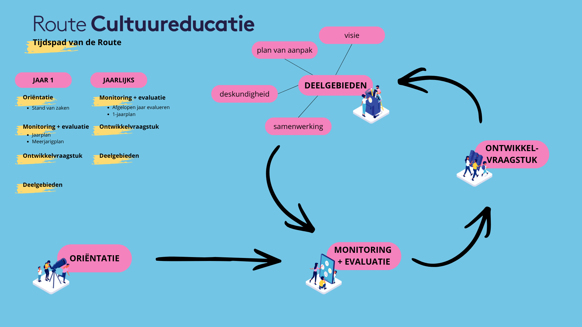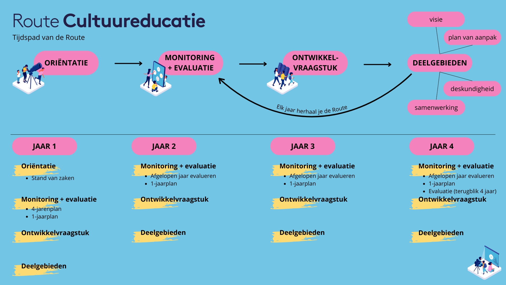 De Route Cultuureducatie is de werkwijze waarop we het programma Cultuureducatie met Kwaliteit (CmK) in de provincie Utrecht vormgeven. De Route geeft houvast en biedt een overzicht van de stappen die jij als begeleider samen met de school kan zetten.